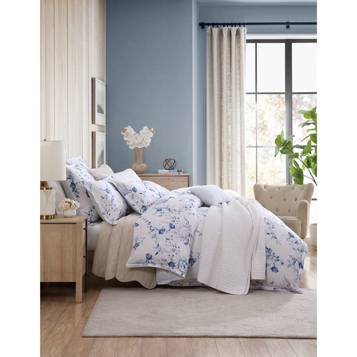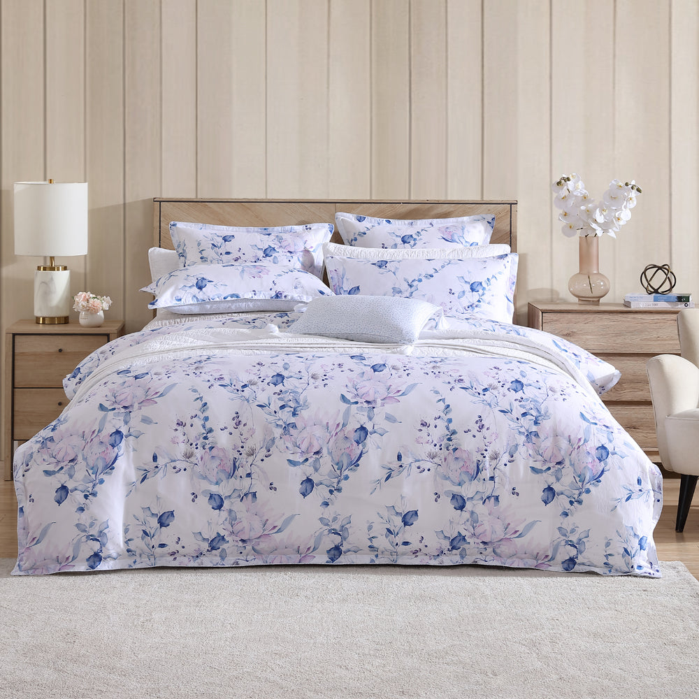 Private Collection Millicent Chambray Super King Quilt Cover Set is a captivating ensemble featuring watercolour flora and fauna in soft blues and indigo tones, creating a beautiful all-over print. The reverse side boasts a charming silhouette print on a white base with a touch of chambray blue colour, offering a versatile and elegant option for a serene bedroom retreat.