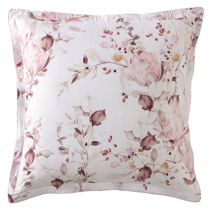 Private Collection Millicent Rose European Pillowcase is a captivating ensemble featuring watercolour flora and fauna in soft pinks and earthy tones, creating a beautiful all-over print. The reverse side boasts a charming silhouette print on a white base with a touch of rose colour, offering a versatile and elegant option for a serene bedroom retreat.