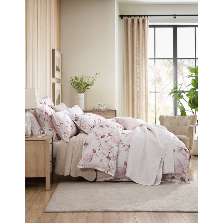 Private Collection Millicent Rose King Bed Quilt Cover Set is a captivating ensemble featuring watercolour flora and fauna in soft pinks and earthy tones, creating a beautiful all-over print. The reverse side boasts a charming silhouette print on a white base with a touch of rose colour, offering a versatile and elegant option for a serene bedroom retreat.
