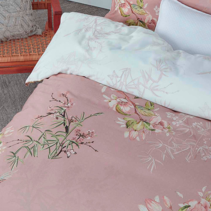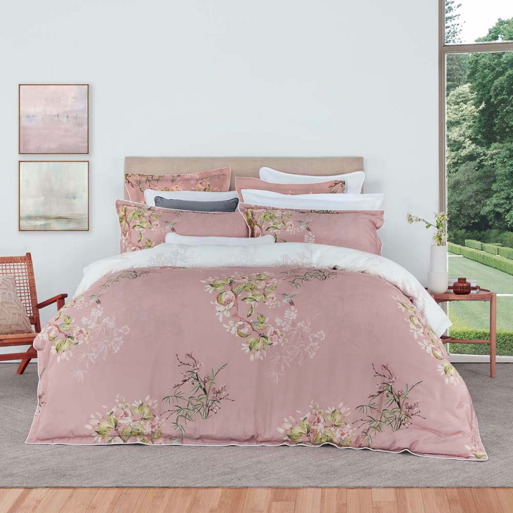 Private Collection Mizumi Blush Queen Bed Quilt Cover Set references the chic simplicity of Japanese art. Pretty in pink, the ground is illustrated with layers of delicate blossoms, the palette cleverly merging leafy shadows into the soft pastels. Edges are neatly framed with a self-flange and white piping.