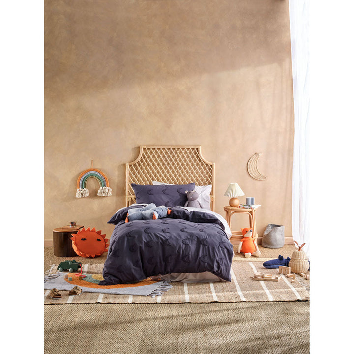Linen House Kids Moon Gaze Navy Queen Bed Quilt Cover Set enjoys textured crescent moons on a soft, cotton ground for a simple and stylish junior bedroom. Elevate this cute ensemble with a range of colourful accessories to match your child's personality.