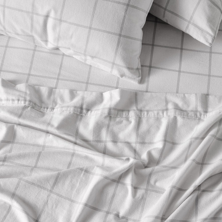 Linen House Morella Smoke Flannelette Single Bed Sheet Set calls for effortless winter styling with its contemporary check in dusk on a grey, brushed cotton ground. Super soft and cosy, this flannelette sheet set includes a cuffed and piped flat sheet and a 45cm fitted sheet to fit most mattresses. Pair it with its coordinating quilt cover set for all-over warmth for the cool nights.