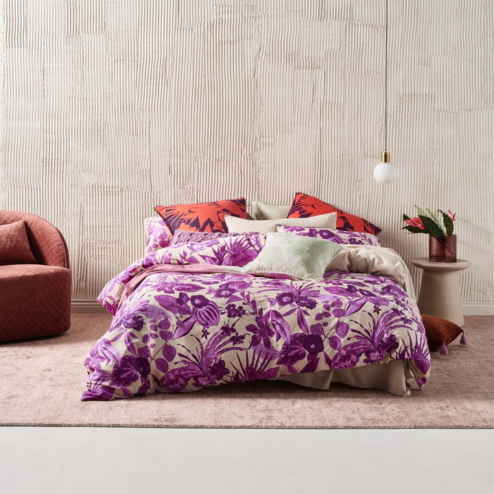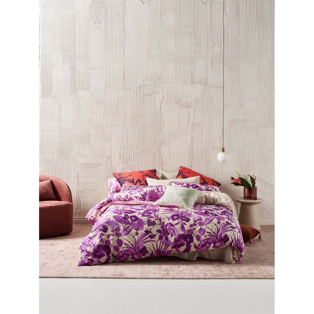 Linen House Nirvana Amethyst Super King Quilt Cover Set challenges boundaries between classic and ultra-modern design. This cotton sateen print, which reverses to a plain-dyed natural hue, will inject a worldly and deeply calming style into your boudoir. Pair this set with our coordinating European pillowcases with tassel trims as well as tufted accessories and natural linens – a stunning complement to Nirvana's depth of colour.
