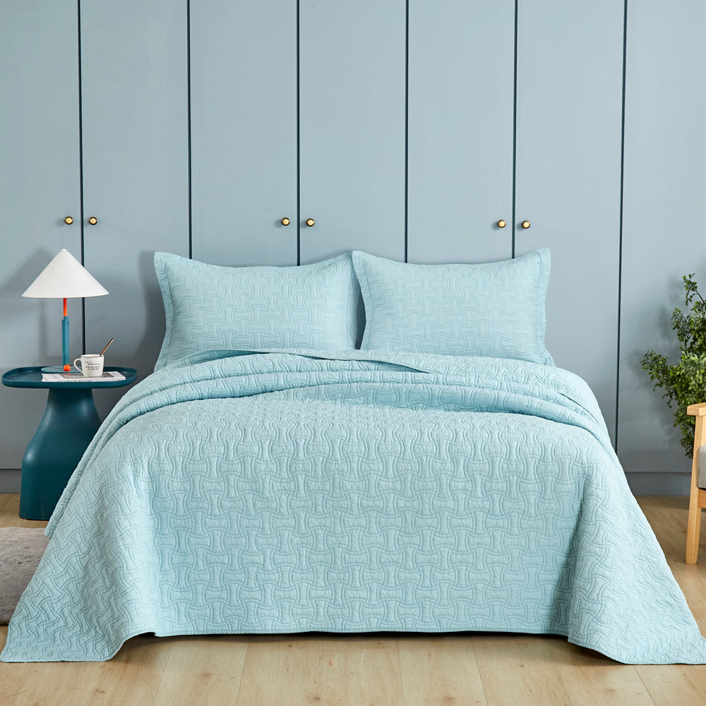 Classic Quilts Oceania Super King Coverlet Set features a jigsaw pattern in ocean blue tones, subtle yet refreshing.