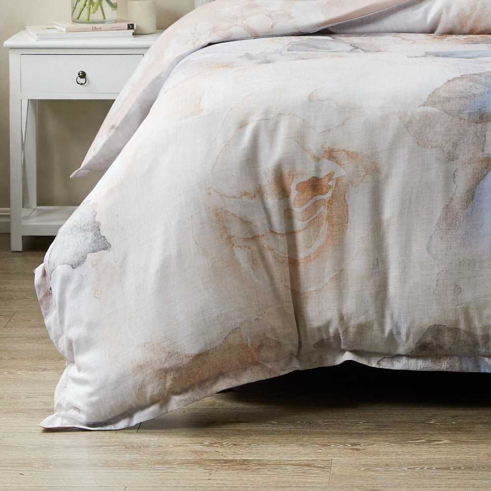 Private Collection Olinda Dune King Bed Quilt Cover Set brings romantic elegance to the bedroom with oversized florals in a whisper soft palette. This classic design is overlayed on the front with a textured print offering added depth. Self-flanged edges and matching European pillowcases complete the look.