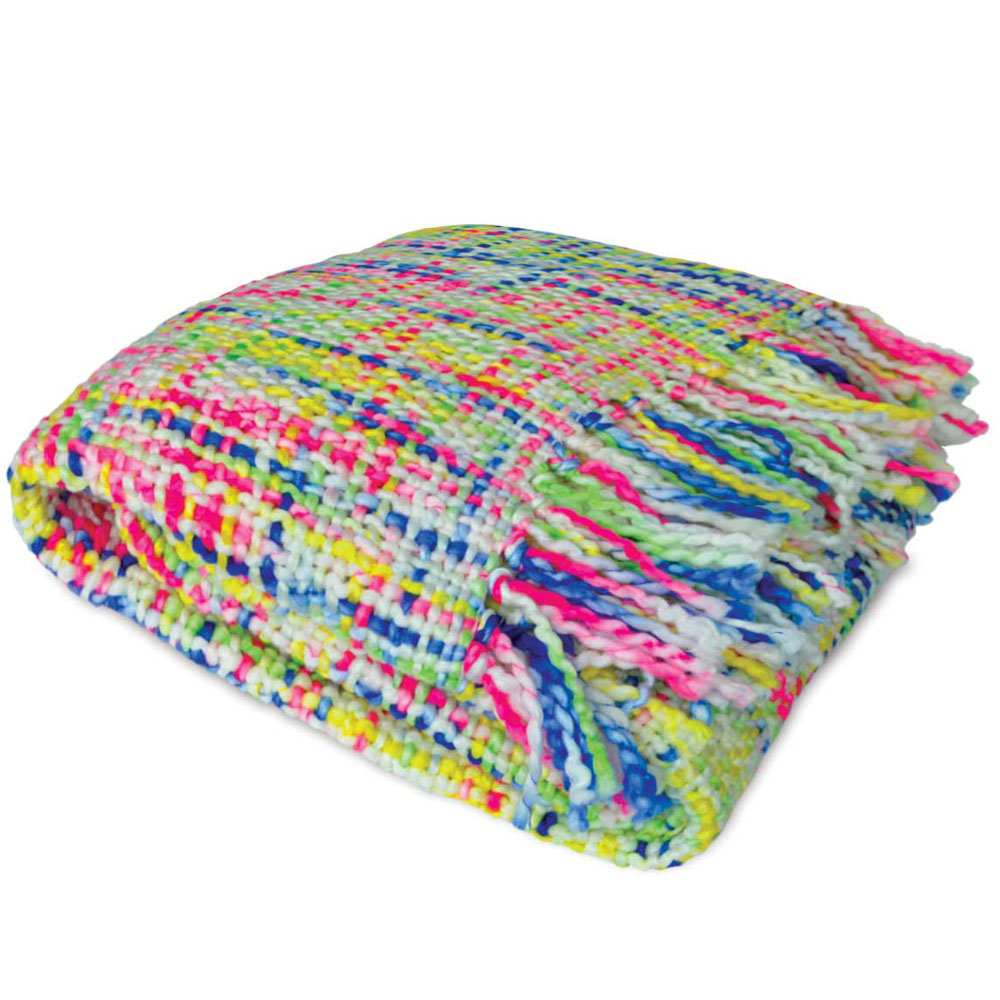 Check out our cheeky summer Oslo acrylic weaved throw. All your friends will be wanting one when you spread it out at the next picnic, beach day or summer sleep in. With punches of all energetic colours, its sure to have the summer hit your looking for! This super comfortable and plushy soft throw features a colourful knitted weave in premium quality 100% acrylic, with stylish fringes in both sides.