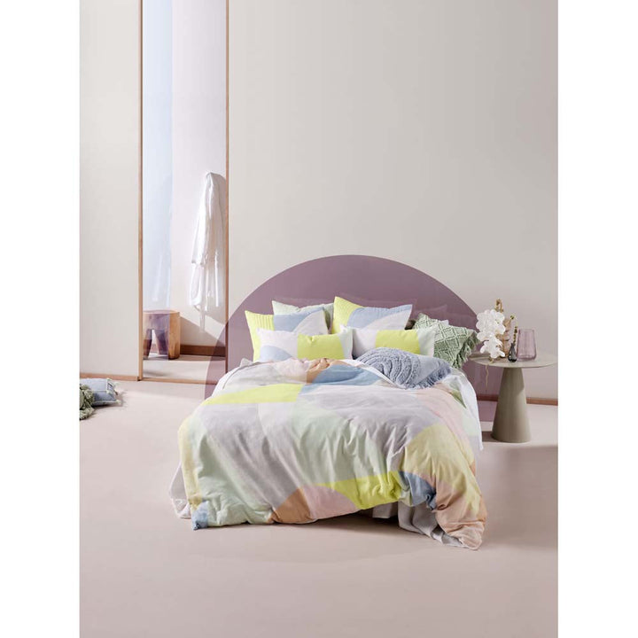 Linen House Otto Multi Queen Bed Quilt Cover Set with soft acidic hues, warm neutrals and a touch of pastel, Otto is a charming geometric print on cotton slub. The set, which features softly painted brushstrokes in a beautifully constructed mélange of curved shapes, looks ever-stylish with its coordinating quilted European pillowcases as well as crisp white sheets and sky-blue cushions with tufted details.