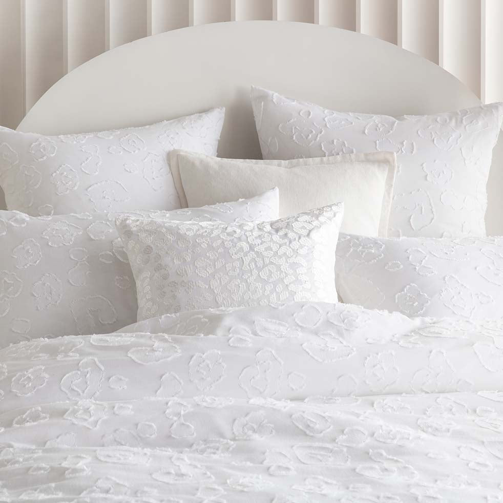 KAS White Perry White King Bed Quilt Cover Set welcomes you to the wild side. Crisp cotton is playfully accented in leopard spots with a raw edge detail, resulting in a trendy, yet subtle take on animal print.