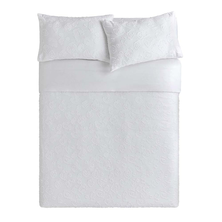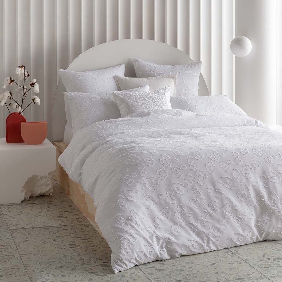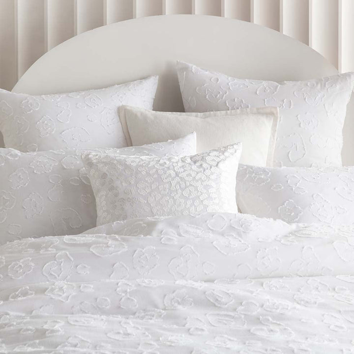 KAS White Perry White Queen Bed Quilt Cover Set welcomes you to the wild side. Crisp cotton is playfully accented in leopard spots with a raw edge detail, resulting in a trendy, yet subtle take on animal print.