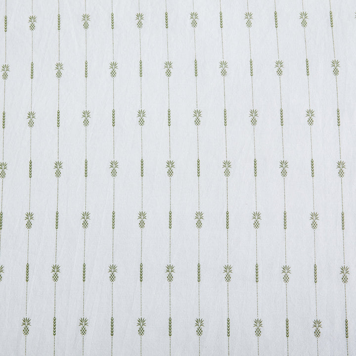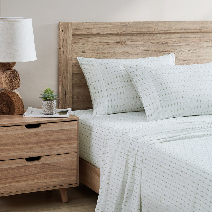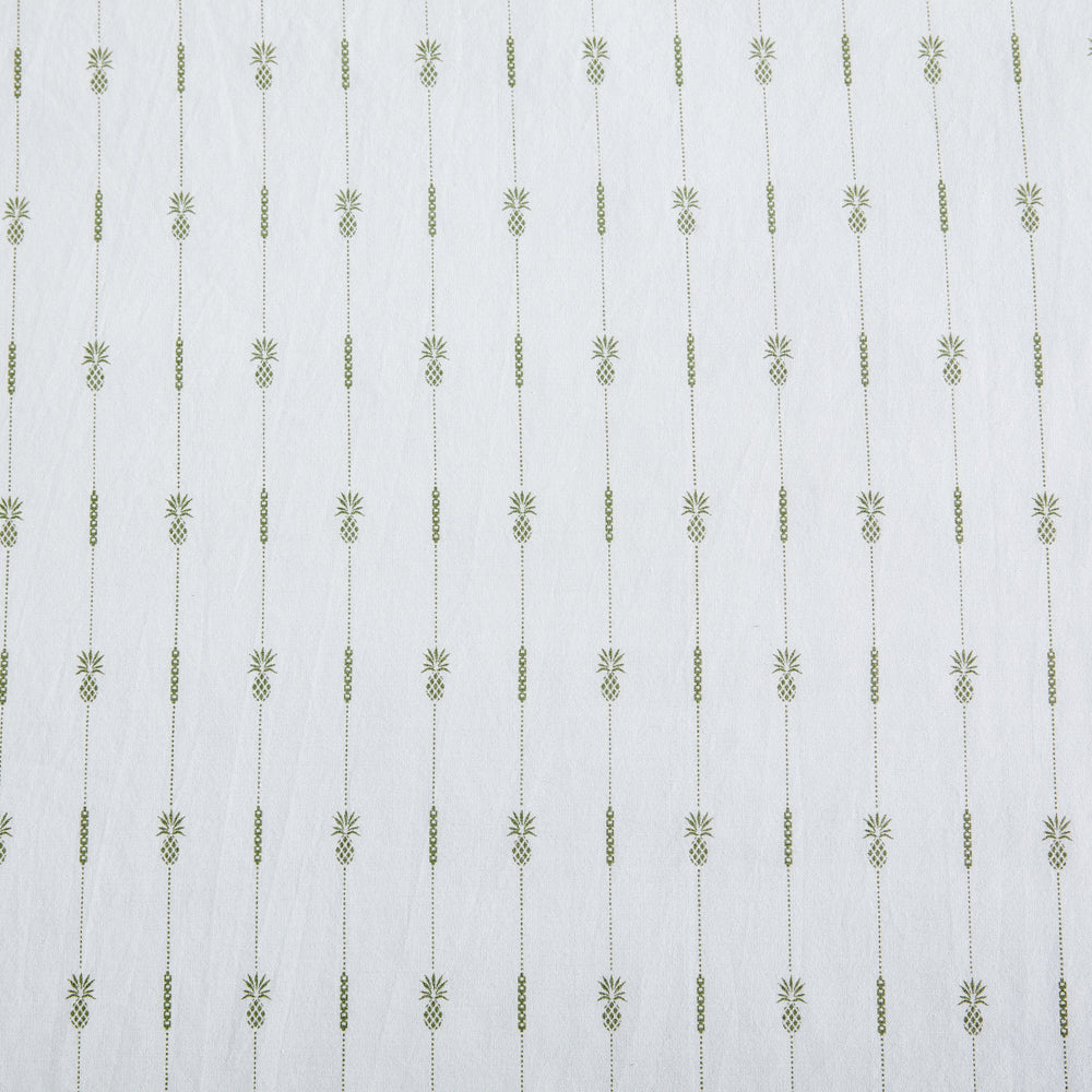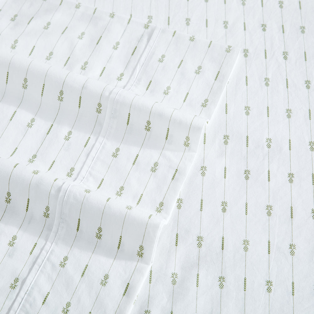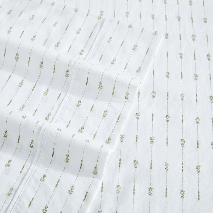 Tommy Bahama Pineapple Stripe Green King Bed Sheet Set features a tiny palm-tone pineapple pattern. These soft and smooth sheets that are primed for relaxation. This four-piece set includes one flat sheet, one fitted sheet, and two pillow cases.