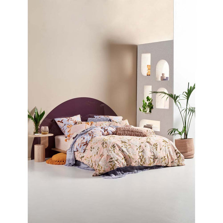 Linen House Pippa Multi Single Bed Quilt Cover Set features a softly hand-painted floral in taupe and bronze on a peach ground along with blush and paprika on one side, while the reverse enjoys a sky-blue ground with blush and paprika. Pippa's printed cotton design is best paired with its European pillowcases with multi-coloured cotton tassels and begs to be surrounded with texture and colour across cushions and throws.