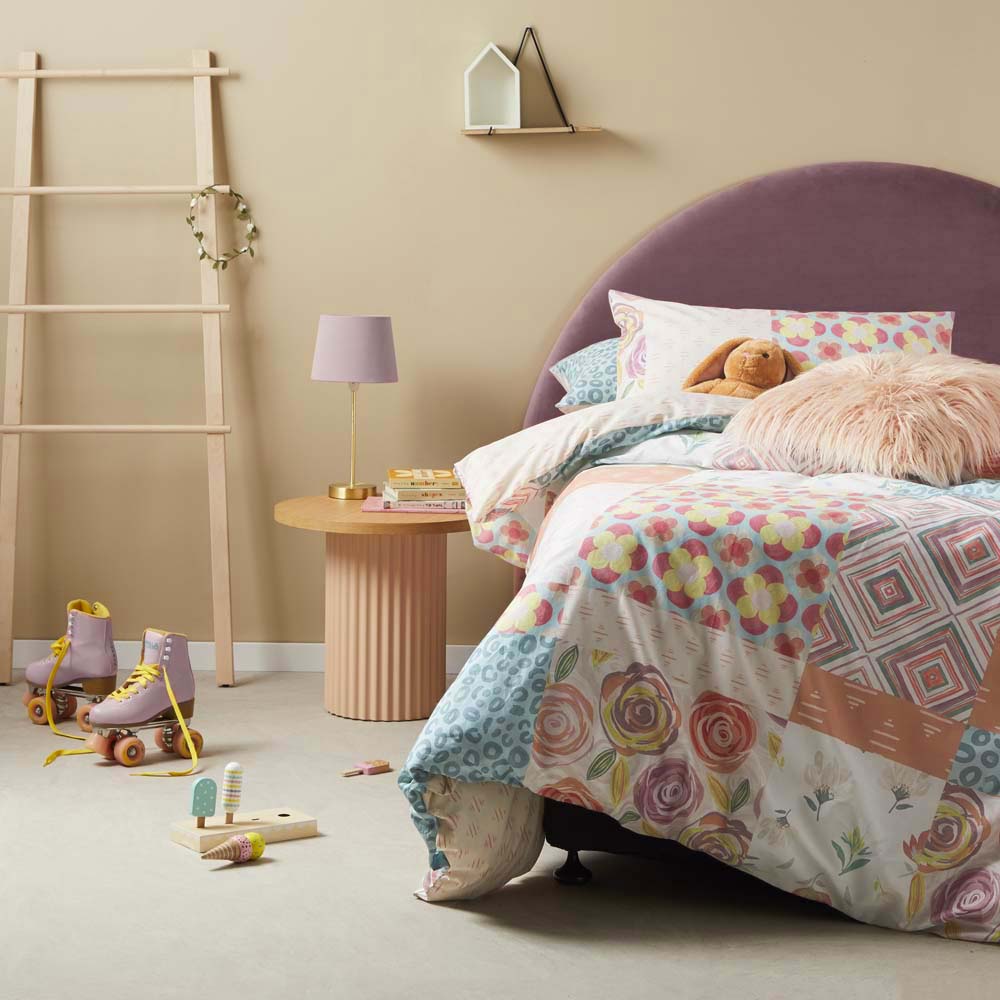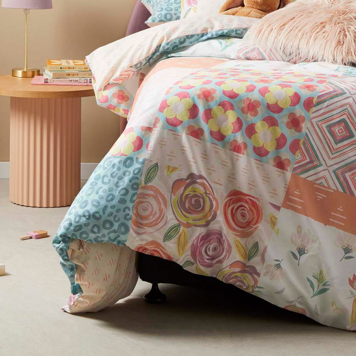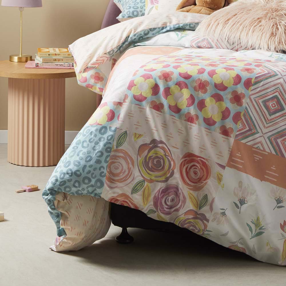 Logan and Mason Pop Patchwork Multi Double Bed Quilt Cover Set is a sweet addition to any girls bedroom. Fresh spring flowers, animal prints and colourful geometrics are printed on this 100% cotton bedding set. A co-ordinated reverse completes this cheerful and colourful design.