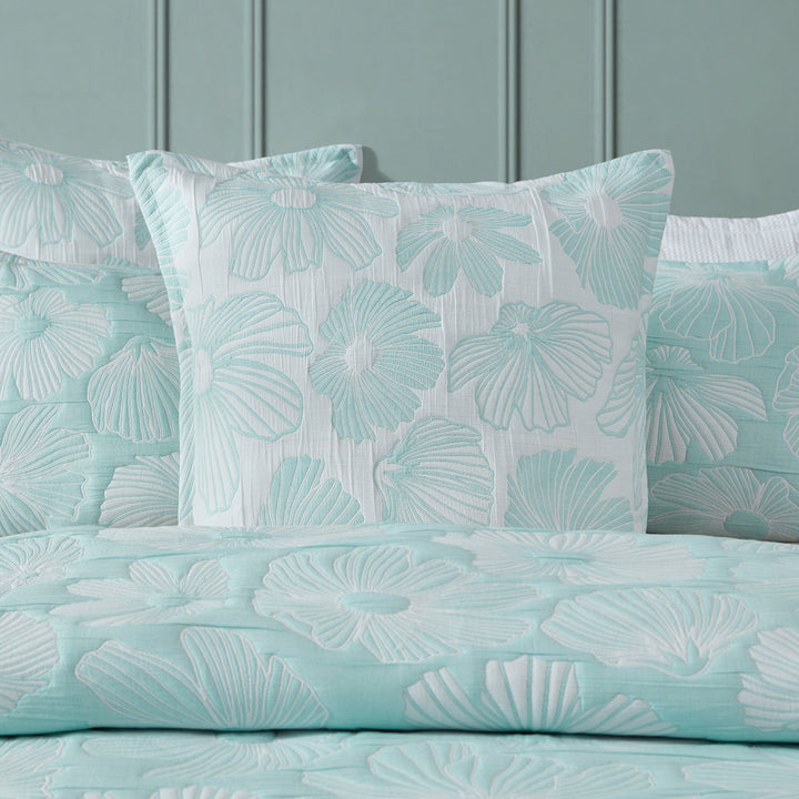 Platinum Logan and Mason Poppi Aqua European Pillowcase is a modern design with a contemporary flair, showcasing stylized poppy flowers in a random pattern repeat. The delicate line work and silhouetted shapes highlight the technical fabric construction. The refined tailored self-flange adds a polished finish to the look.