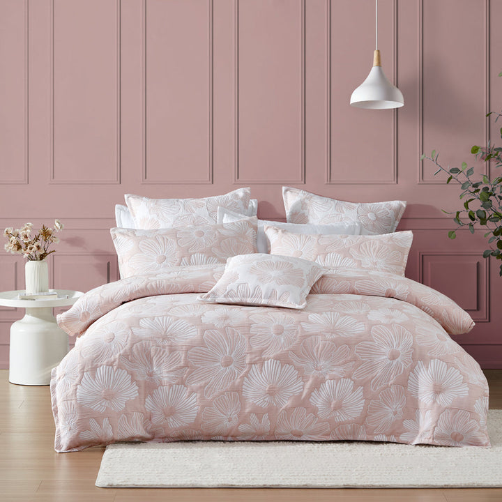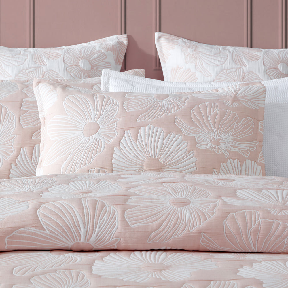 Platinum Logan and Mason Poppi Rose Queen Bed Quilt Cover is a modern quilt cover with a contemporary flair, showcasing stylized poppy flowers in a random pattern repeat. The delicate line work and silhouetted shapes highlight the technical fabric construction, creating the perfect reversible fabric which can be seen within the accessories. The refined tailored self-flange adds a polished finish to the look.