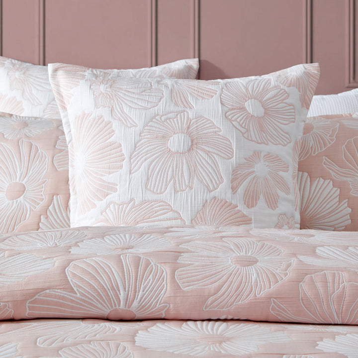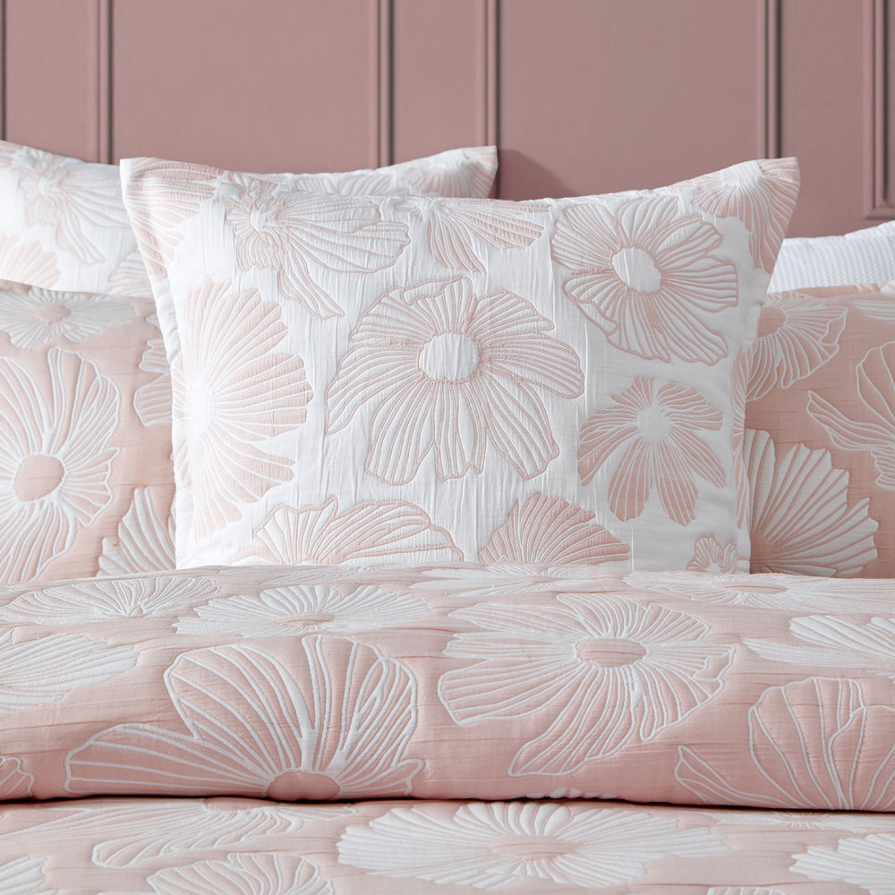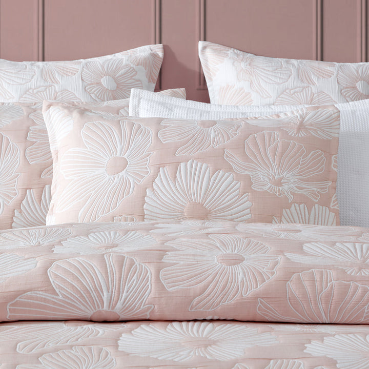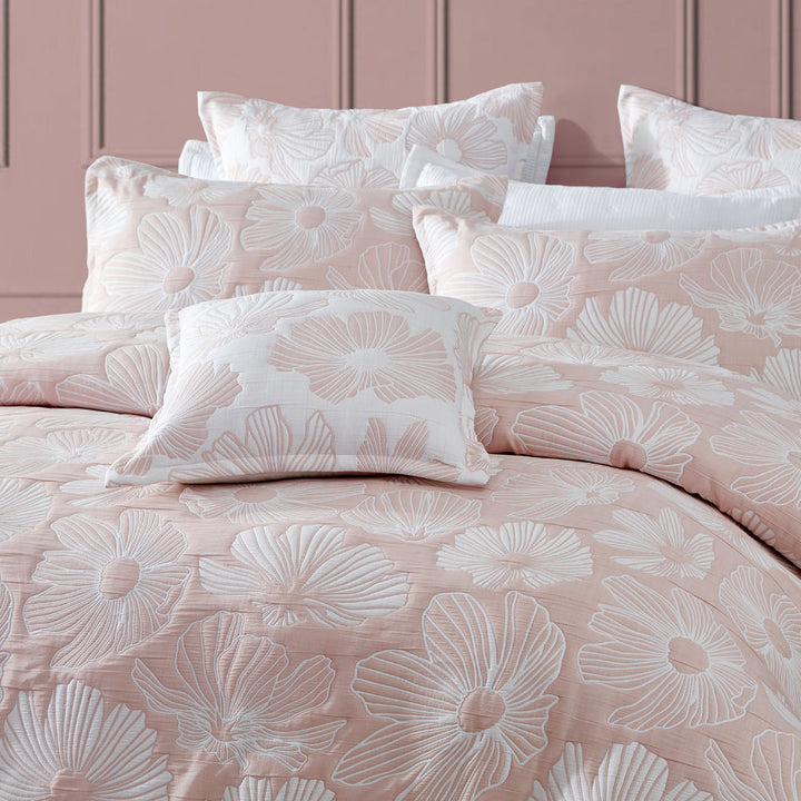 Platinum Logan and Mason Poppi Rose Super King Quilt Cover is a modern quilt cover with a contemporary flair, showcasing stylized poppy flowers in a random pattern repeat. The delicate line work and silhouetted shapes highlight the technical fabric construction, creating the perfect reversible fabric which can be seen within the accessories. The refined tailored self-flange adds a polished finish to the look.