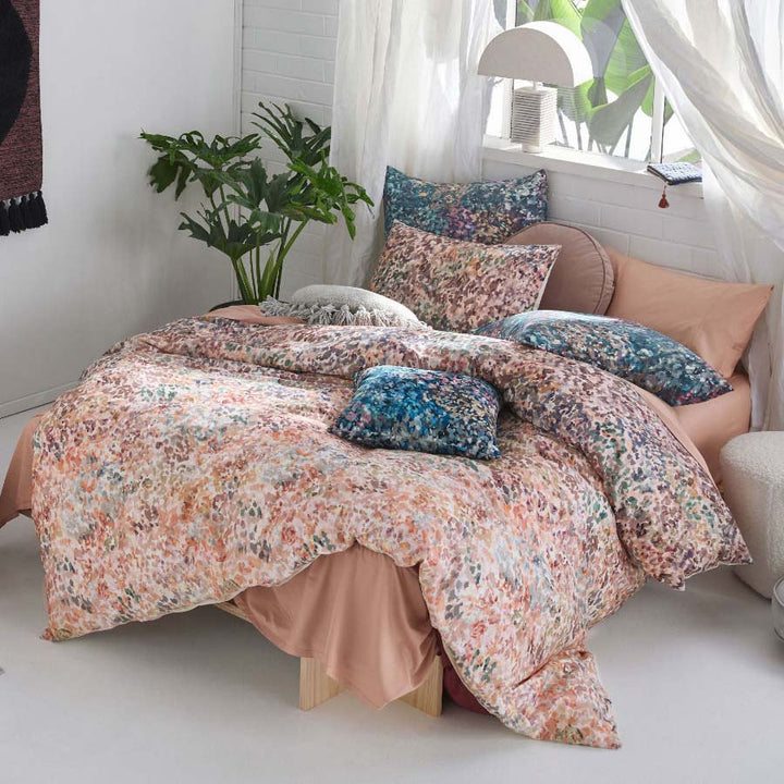 Linen House Prairie Teal Queen Bed Quilt Cover Set is abstract in design and reminiscent of flowering meadows, this graduating mélange in the prettiest shades of the season is printed on a luxe cotton sateen. Prairie looks outstanding paired not only with plain-dyed hues but also its coordinating European pillowcases and printed velvet cushion for depth.