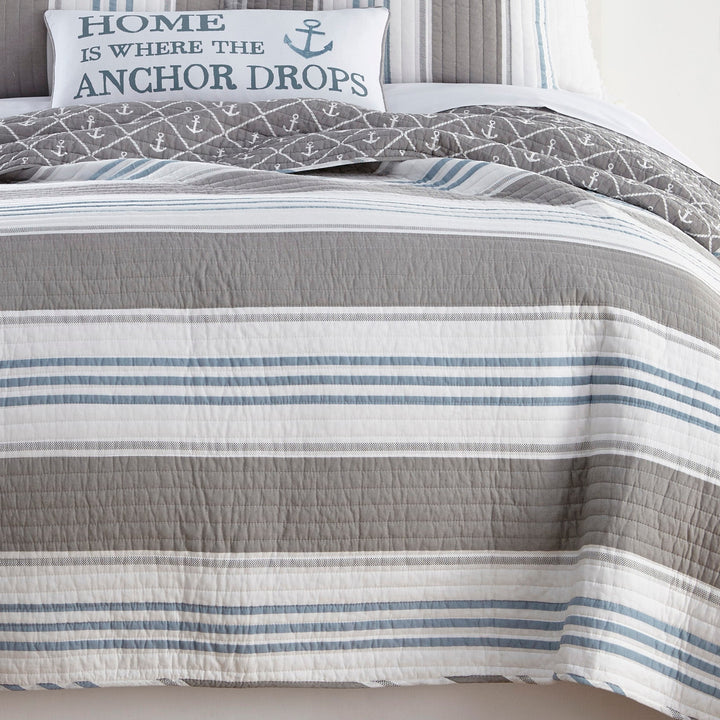 Classic Quilts Province Queen Bed Coverlet Set features a stunning striped pattern. With a grey and blue striped design, this homely pattern embraces a more traditional style and puts a modern twist on it. It reverses to a grey coloured pattern that has anchors. Made with a lovely soft 100% cotton fabric and filled with a 260GSM cotton filling, this coverlet will be an amazing addition to any bedroom.
