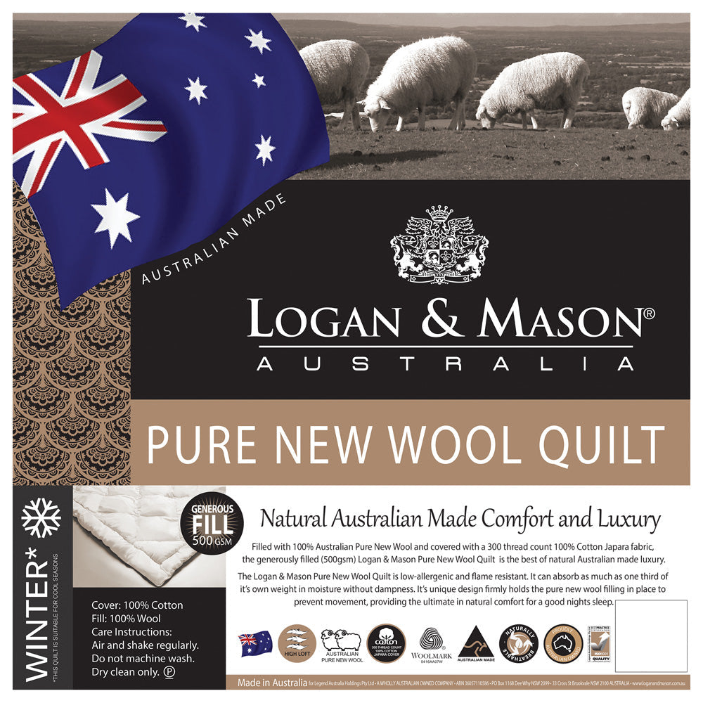 The King Bed Logan & Mason Pure New Wool Quilt is non-allegenic, and flame resistant. It can absorb as much as one third of its weight in moisture without dampness. Its unquie design firmly holds the pure new wool filling in place to prevent movement, providing the ultimate in natural comfort for a goods nights sleep. Featuring a High Loft this Quilt is equivalent to 2 to 3 blankets in warmth. Features Non Allergenic 300 Thread Count 100% Cotton Japara Cover 100% Australian Pure New Wool Fill - 500GSM Woolmark Registered Dry Clean Only