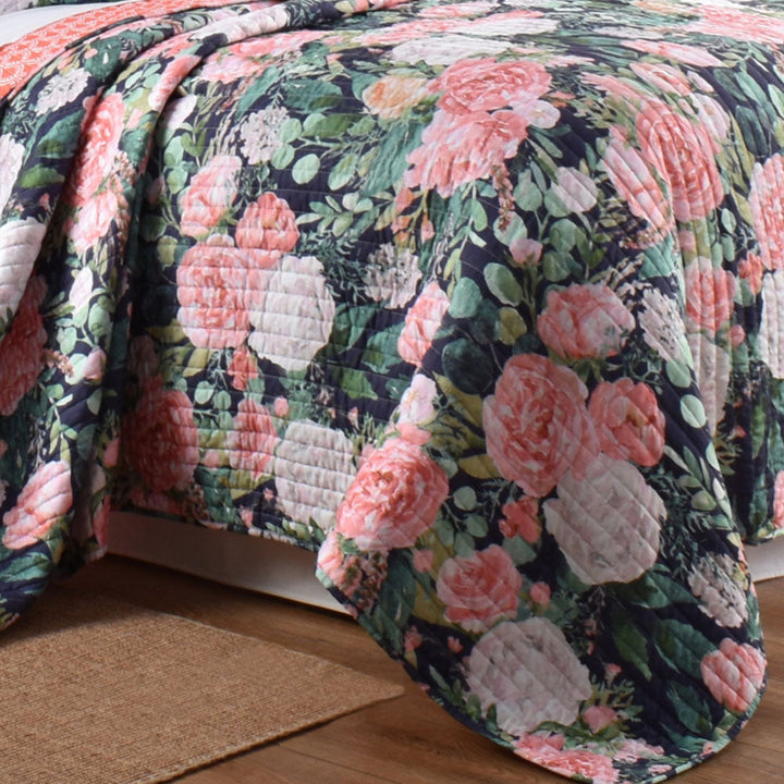 Classic Quilts Queens King Bed Coverlet Set features stunning floral blooms on a navy base. The design is printed on a cotton outer, and contains a light-loft cotton fill for breathability and comfort. The reverse is a modern geometric design in the a vibrant pink colour, to ensure that the coverlet coordinates with your bedroom.