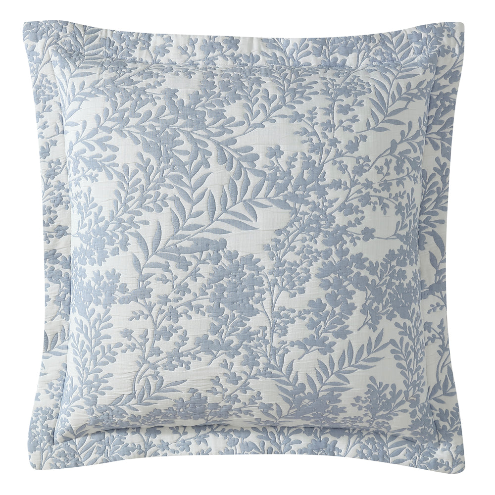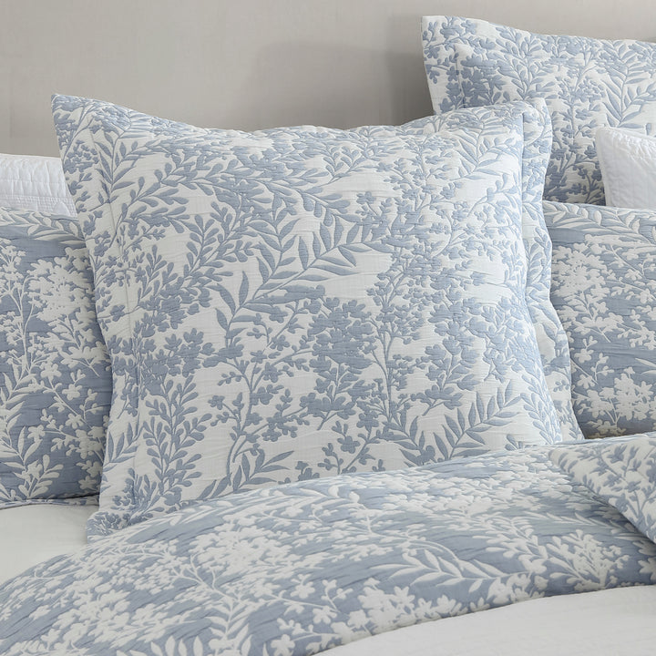 Private Collection Quinn Denim European Pillowcase. Immerse yourself in nature with this native Australian foliage inspired pillowcase. Simple silhouettes are highlighted by the use of solid block colours. The classic woven structure creates a modern matte appearance.