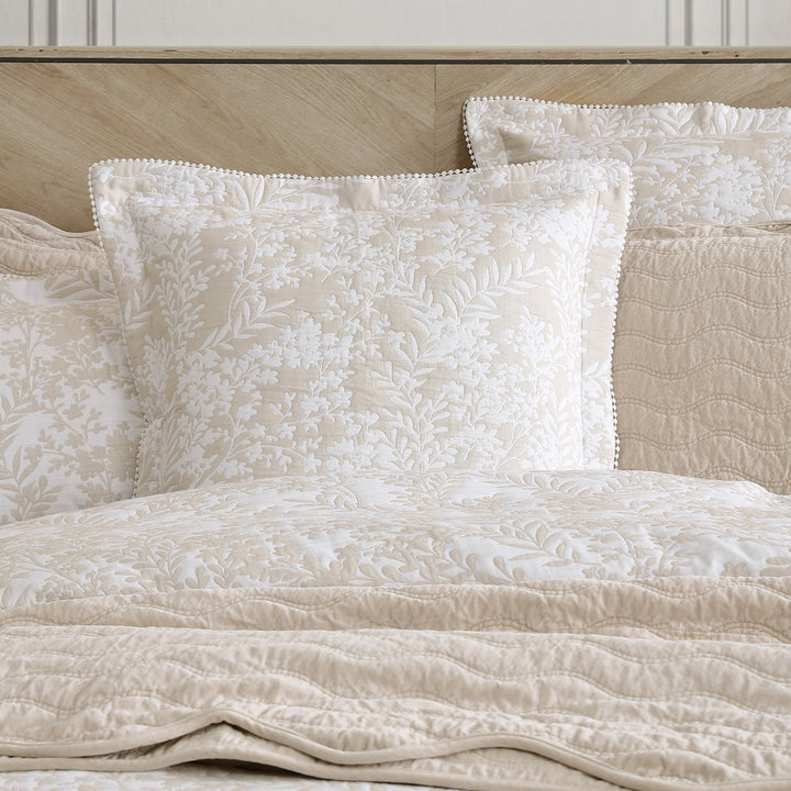 Private Collection Quinn Stone King Bed Quilt Cover Set. Immerse yourself in nature with this native Australian foliage inspired quilt set. Simple silhouettes are highlighted by the use of solid block colours, both the stone and surf popping against the soft white. The classic woven structure creates a modern matte appearance, while the pompom lace trim gives more of a vintage look.