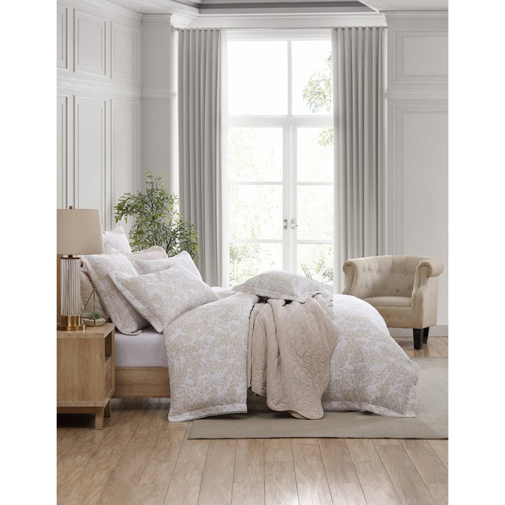 Private Collection Quinn Stone Queen Bed Quilt Cover Set. Immerse yourself in nature with this native Australian foliage inspired quilt set. Simple silhouettes are highlighted by the use of solid block colours, both the stone and surf popping against the soft white. The classic woven structure creates a modern matte appearance, while the pompom lace trim gives more of a vintage look.