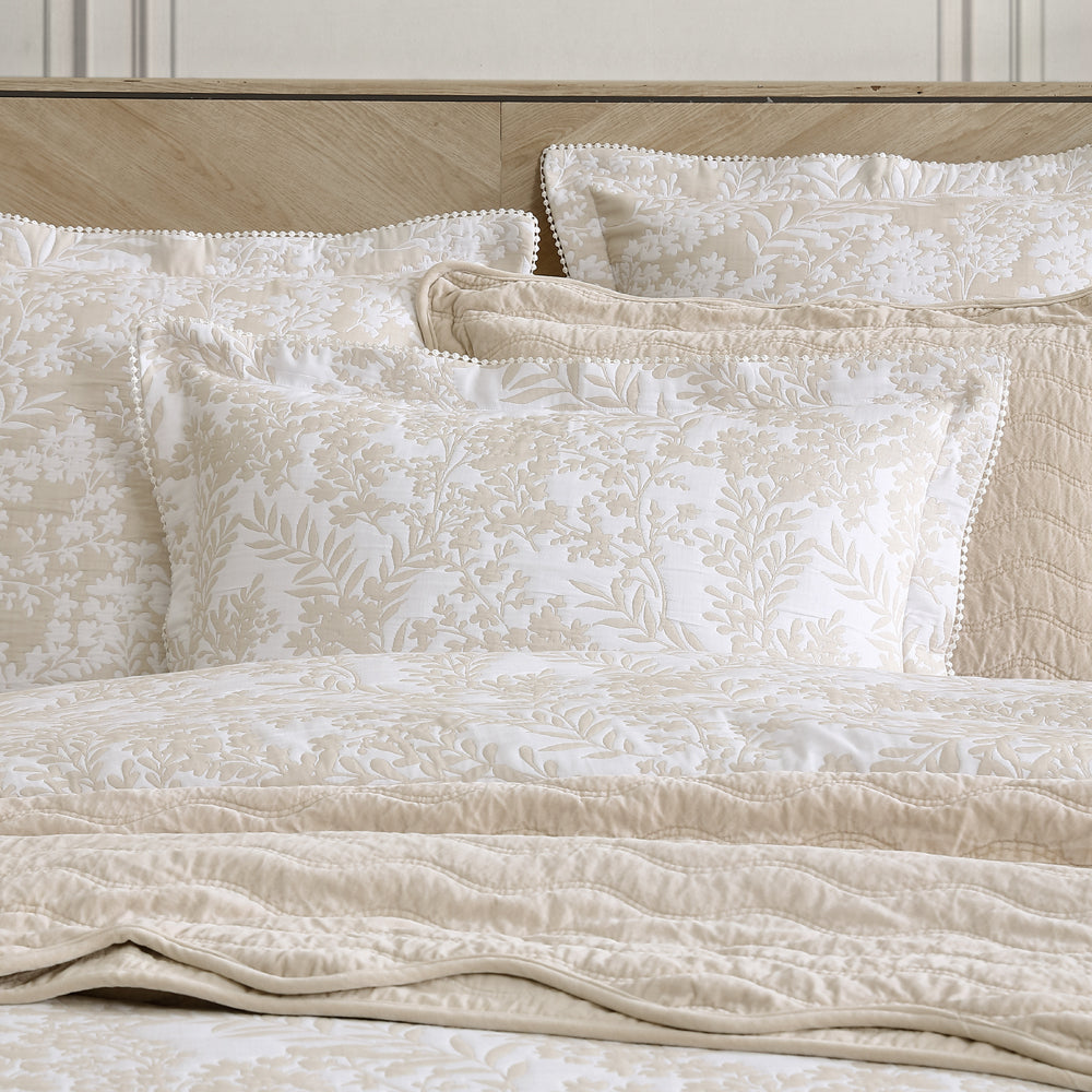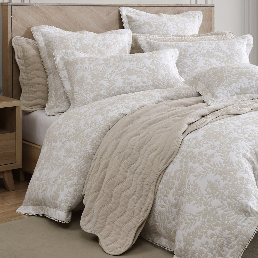 Private Collection Quinn Stone Super King Quilt Cover Set. Immerse yourself in nature with this native Australian foliage inspired quilt set. Simple silhouettes are highlighted by the use of solid block colours, both the stone and surf popping against the soft white. The classic woven structure creates a modern matte appearance, while the pompom lace trim gives more of a vintage look.
