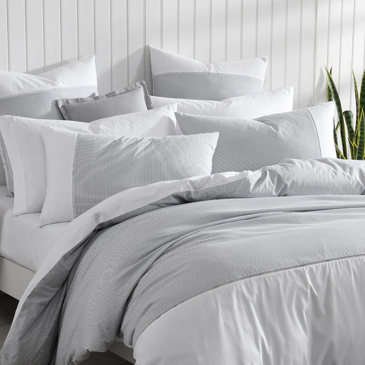 Platinum Logan and Mason Radley Charcoal Single Bed Quilt Cover Set breathes life into your bedroom. Cotton rich percale fabric is printed with a delicate pinstripe and is elegantly finished with inserted white ladder tape. Enhance with Radley's matching european pillowcases to complete the look.