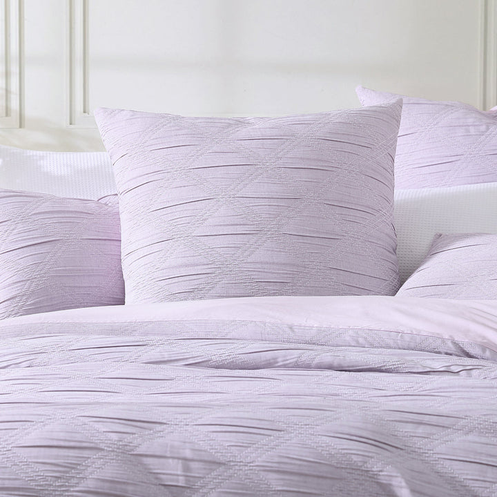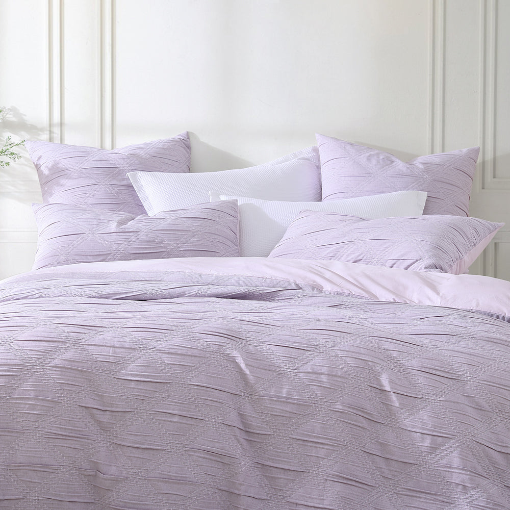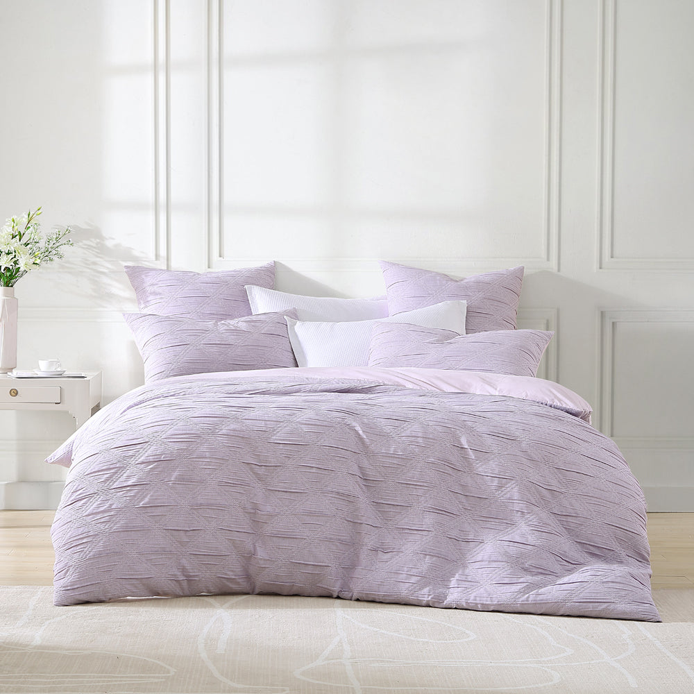 Platinum Logan and Mason Reine Lilac Queen Bed Quilt Cover Set works a fashion-inspired monochrome palette into a large scale diamond design, each shape boldly defined by contrast pick stitching. Bolster the look with co-ordinating European pillowcases.