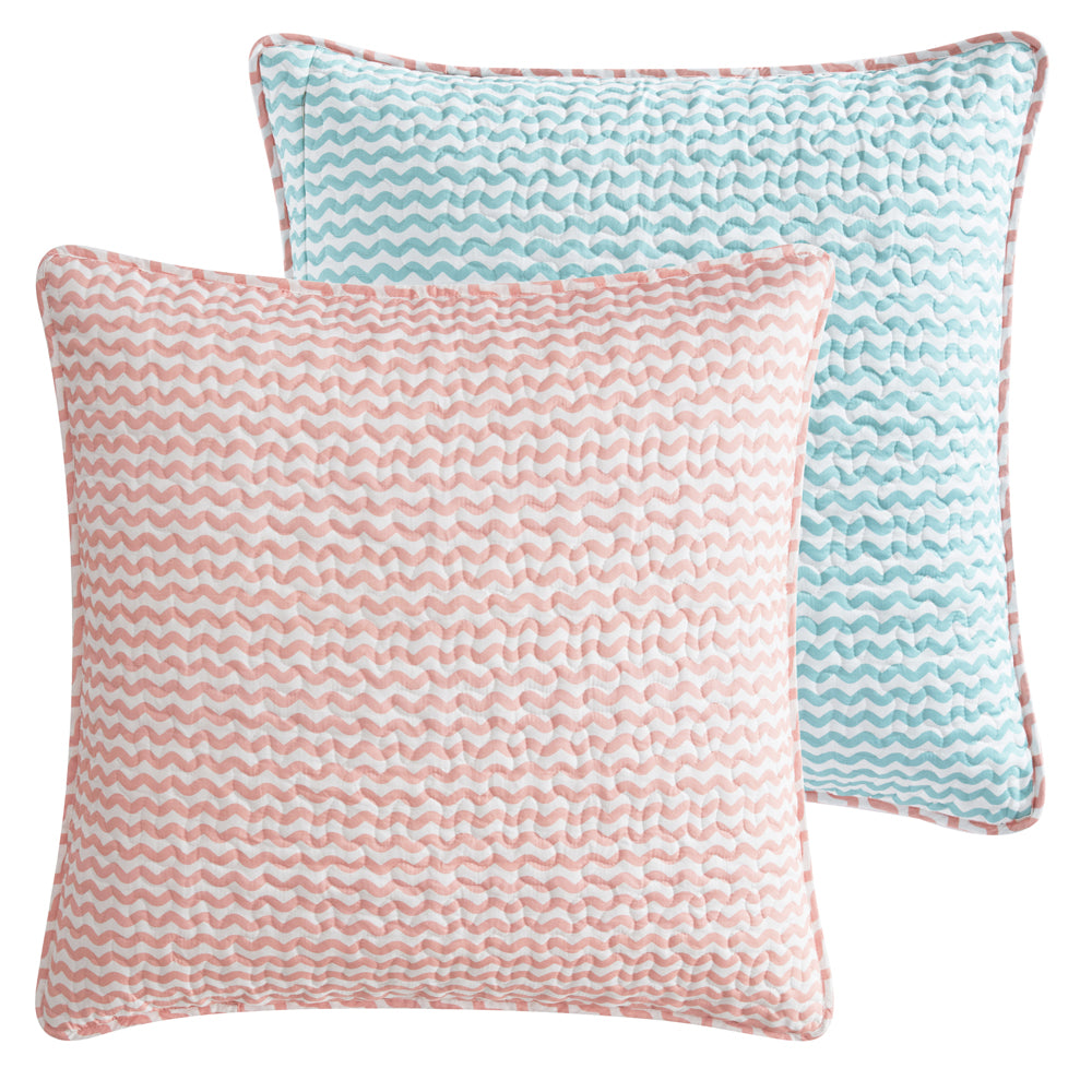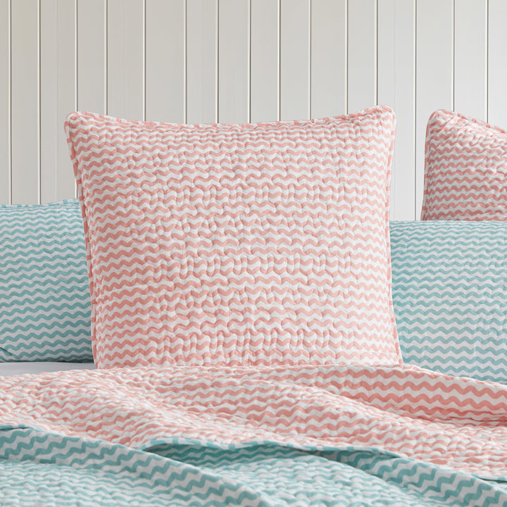 Playful and effortlessly stylish, the Ric Rac Quilted European Pillowsham brings a bold yet simple charm to your bedroom. Featuring a classic ric rac stripe in vibrant teal, this design adds a fun, rhythmic touch with its wavy, free-flowing lines. The all-over squiggle quilting pattern enhances the texture, creating a cozy and inviting feel. For a striking contrast, the reverse side showcases the same lively design in a warm tangerine hue, offering a fresh, versatile look. Perfect for layering or as a lightweight bedding option, the Ric Rac Quilted European Pillowsham adds a modern, energetic vibe to any space.