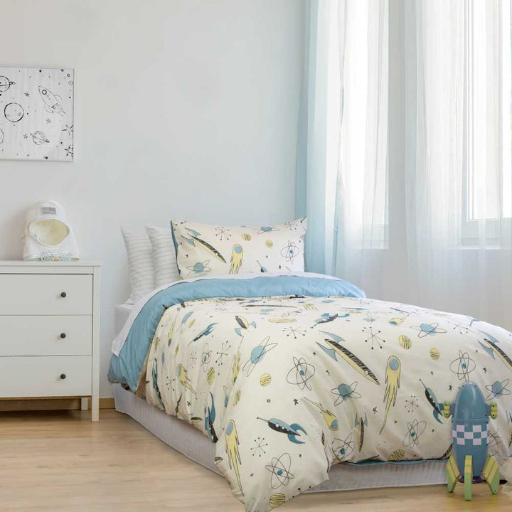 Jelly Bean Kids Rocket Boy Chambray Single Bed Quilt Cover Set will have your little astronaut going to bed feeling inspired! Let their dreams take them far and wide across the cosmos. Reverses to a plain blue.