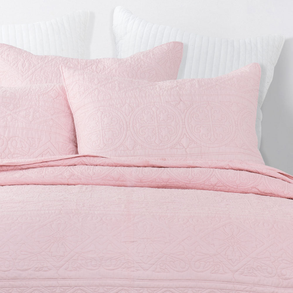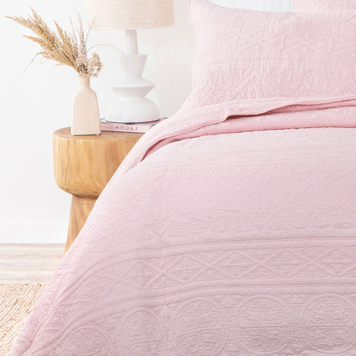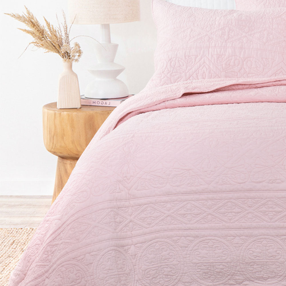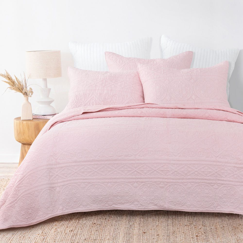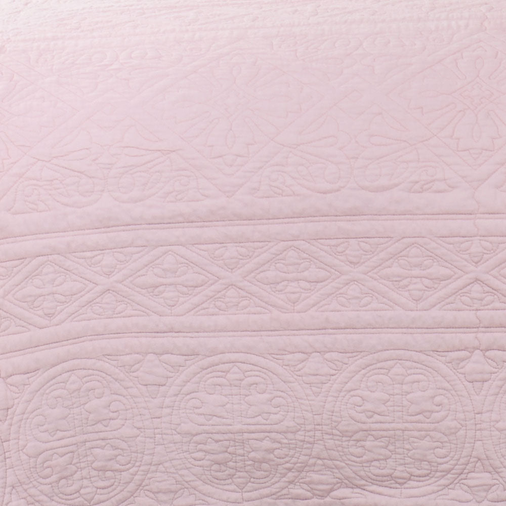 Classic Quilts Rose Quartz Super King Coverlet Set features a beautiful pink textured design. The design is printed on a cotton outer, and contains a light-loft cotton fill for breathability and comfort. The reverse is a geometric design on a pink coloured background, to ensure that the coverlet coordinates with your bedroom.