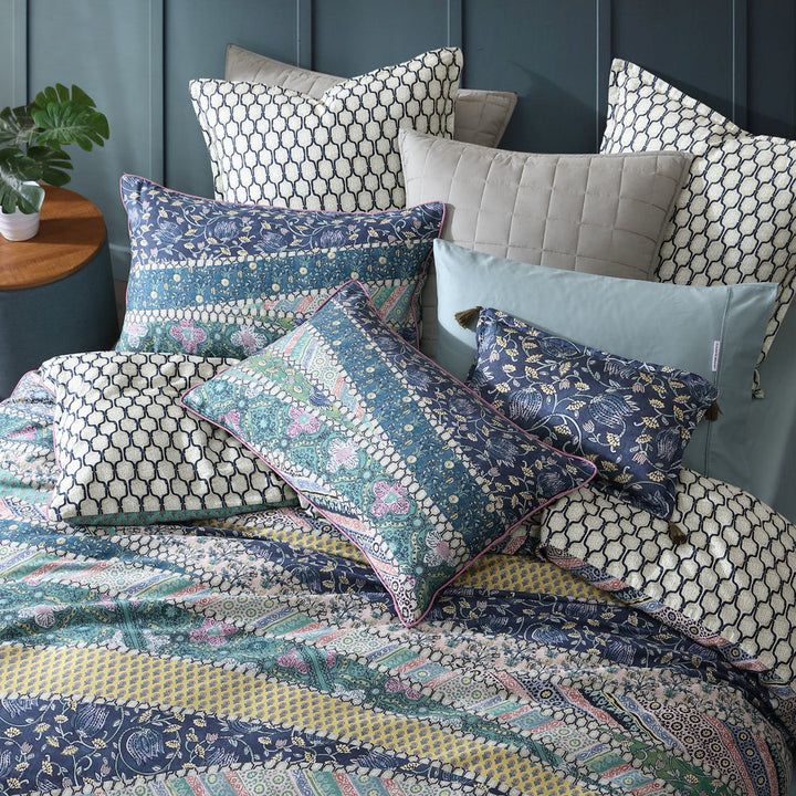 Logan and Mason Rumi Queen bed quilt cover set is a mesmerizing journey into the realm of bohemian elegance and artistic expression. Embrace the free-spirited essence of boho style as you immerse yourself in the intricate waves enveloping a tapestry of bohemian patterns and floral textures. Adding to its allure, the reverse side features a hand-drawn boho-inspired geo print. This print offers a complementary visual experience, presenting a more structured and yet artistically vibrant alternative to the intricate front design.