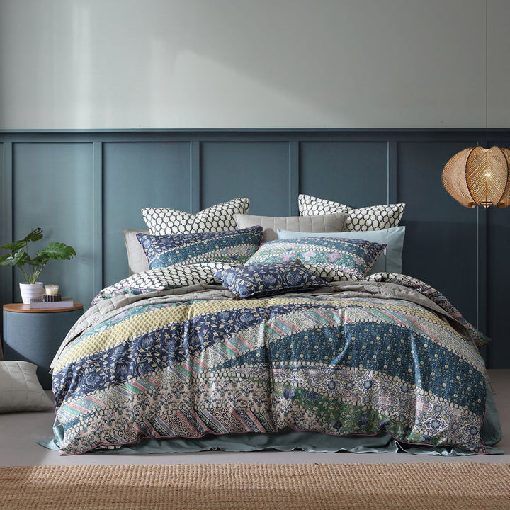 Logan and Mason Rumi Super King quilt cover set is a mesmerizing journey into the realm of bohemian elegance and artistic expression. Embrace the free-spirited essence of boho style as you immerse yourself in the intricate waves enveloping a tapestry of bohemian patterns and floral textures. Adding to its allure, the reverse side features a hand-drawn boho-inspired geo print. This print offers a complementary visual experience, presenting a more structured and yet artistically vibrant alternative to the intricate front design.