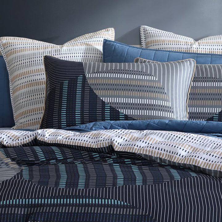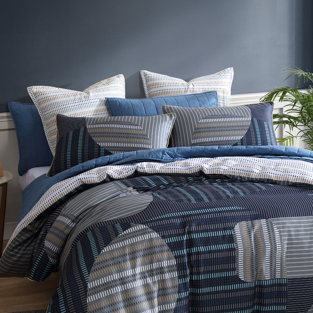 Logan and Mason Statham Navy Super King quilt cover set. Introduce a bold use of pattern to your bedroom with Statham, a contemporary geometric. Over scaled shapes with stripes, stitch like details and markings to form a textural and balanced composition. In shades of blue, grey, and caramel, a more masculine appeal has been achieved.