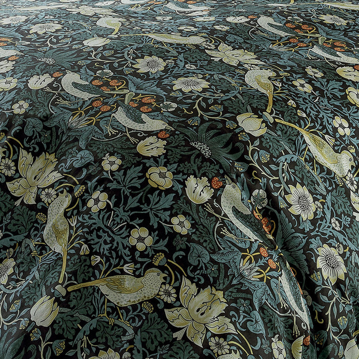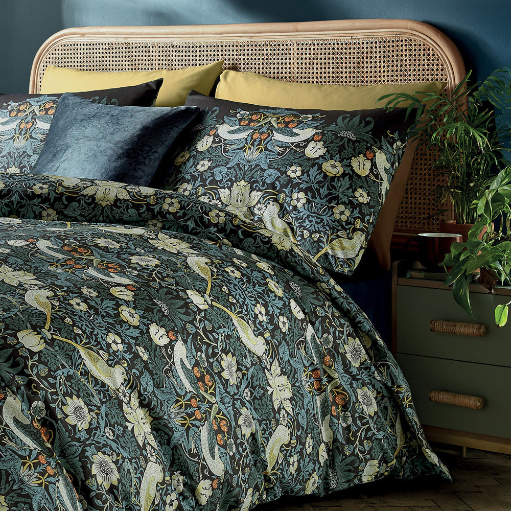 Add classic charm to your bedroom with the Strawberry Thief queen bed quilt cover set by William Morris. Crafted from crisp 100% cotton percale, this quilt cover set offers a smooth, breathable feel all year round. The iconic bird-and-berry pattern brings heritage style and timeless elegance to your space—perfect for those who love quality and enduring design.