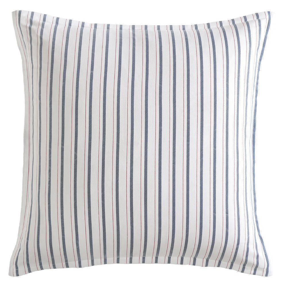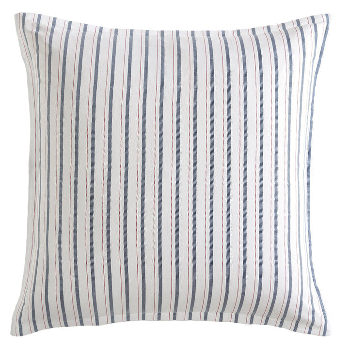 Logan and Mason Summerville european pillowcase is a stripe design with a base of white with red and navy stripes, adding versatility to the overall aesthetic.