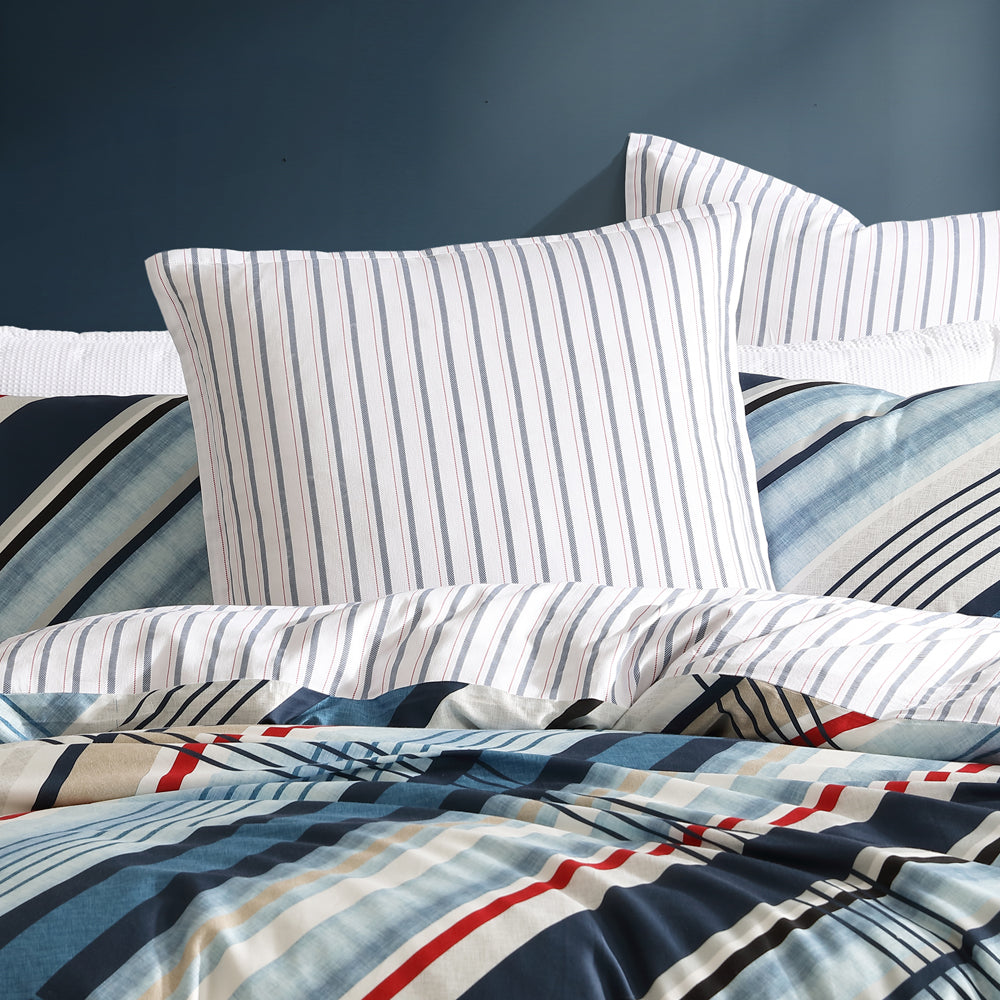 Logan and Mason Summerville Double bed quilt cover set showcases an array of diagonal stripes, elegantly weaving together the classic colour palette. Red, navy, and white tones alongside natural textured stripes evokes a sense of maritime nostalgia, reminiscent of seaside landscapes and nautical aesthetics. These stripes, arranged diagonally, infuse a dynamic and modern touch while maintaining a timeless appeal. On the reverse side, a complementary stripe design with a base of white with red and navy stripes, adding versatility to the overall aesthetic.