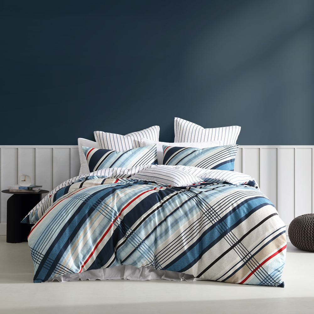 Logan and Mason Summerville Queen bed quilt cover set showcases an array of diagonal stripes, elegantly weaving together the classic colour palette. Red, navy, and white tones alongside natural textured stripes evokes a sense of maritime nostalgia, reminiscent of seaside landscapes and nautical aesthetics. These stripes, arranged diagonally, infuse a dynamic and modern touch while maintaining a timeless appeal. On the reverse side, a complementary stripe design with a base of white with red and navy stripes, adding versatility to the overall aesthetic.