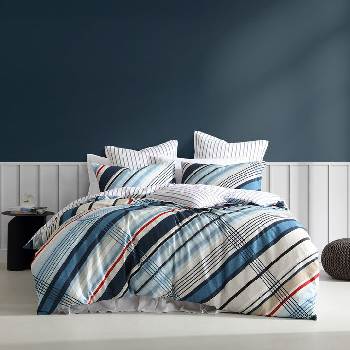 Logan and Mason Summerville Super King quilt cover set showcases an array of diagonal stripes, elegantly weaving together the classic colour palette. Red, navy, and white tones alongside natural textured stripes evokes a sense of maritime nostalgia, reminiscent of seaside landscapes and nautical aesthetics. These stripes, arranged diagonally, infuse a dynamic and modern touch while maintaining a timeless appeal. On the reverse side, a complementary stripe design with a base of white with red and navy stripes, adding versatility to the overall aesthetic.