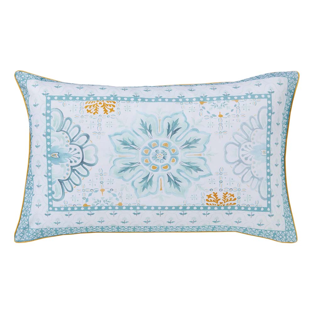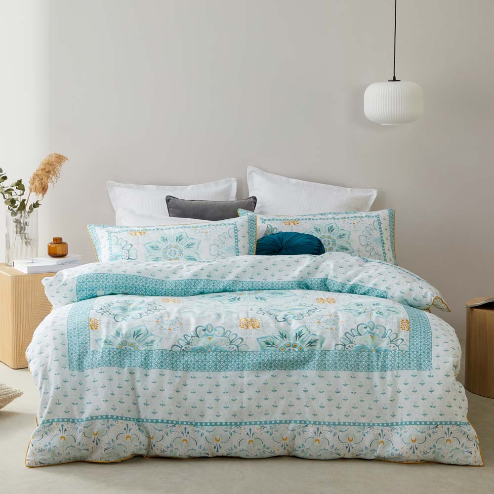 Logan and Mason Sunday Spring King Bed Quilt Cover Set takes a relaxed approach to the intricate and ornate style of Moroccan mosaics. The floral and geometric motifs are arranged in a panel composition with a defining border in soft, pastel shades. The front is co-ordinated with the all-over printed reverse, framed with piped edges in mustard.