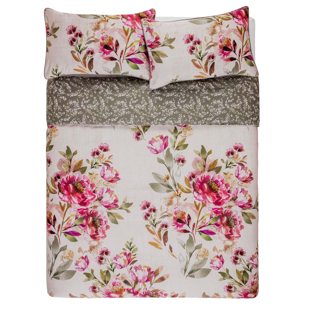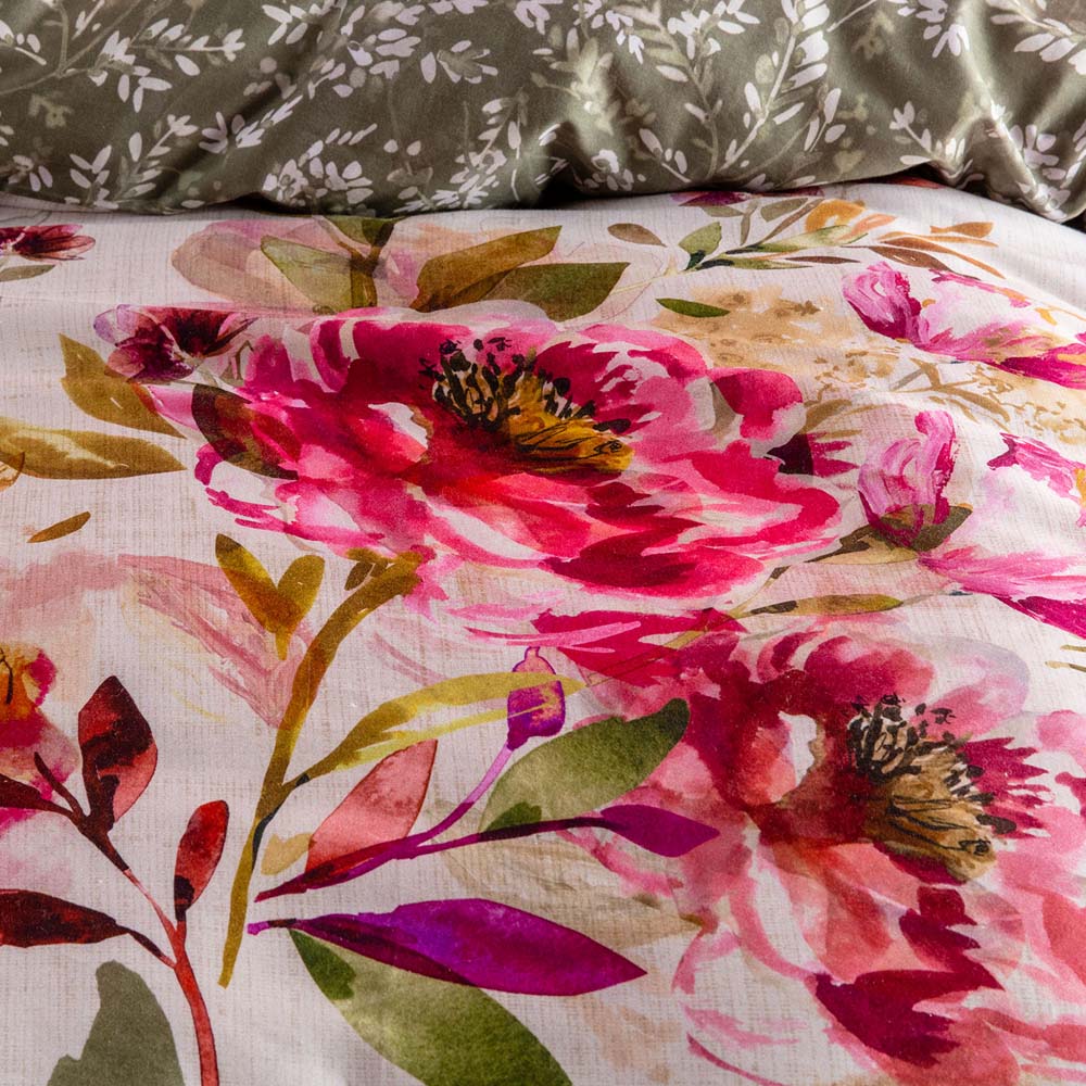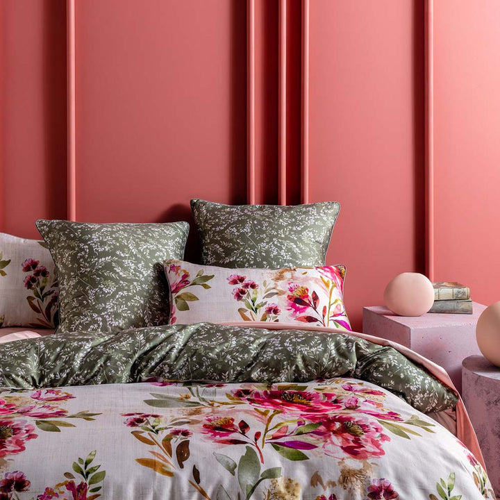 KAS Taneya Multi Super King Quilt Cover Set is stylish and fun, and delivers an edge through any season with its playful contrast colour palette. Crafted from a luxuriously silky cream cotton sateen, the cover features vibrant watercolour flowers blooming in sunburst pink and golden tones, while the reverse delights with sprawling greenery in an olive and white palette.
