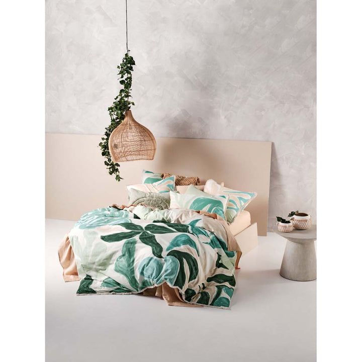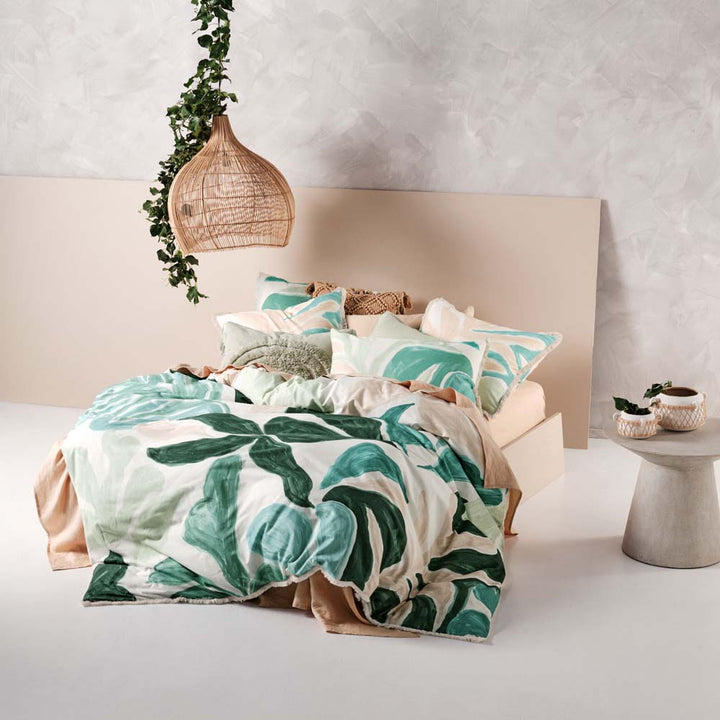 Linen House Terrarium Green Queen Bed Quilt Cover Set features softly camouflaged leaves in a peacefully lush palette. Terrarium is beautifully painted with texture and movement, resulting in this greenhouse-like printed aesthetic on cotton slub. Complete with fringing, this heavenly set looks magnificent styled with its coordinating European pillowcases along with shades of paprika, wasabi and biscotti across tufted and woven accessories for dimension.