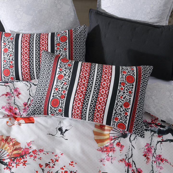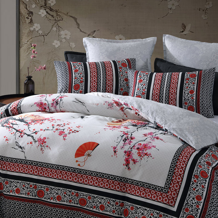 Logan and Mason Tokyo Drift Red Queen bed quilt cover set, drift off to sleep among cherry blossoms and whimsical oriental fans. A bold border print of oriental themed pattern frames this design. A soft oriental tonal reverse compliment the front statement piece. Finished off with a flat piping edge.