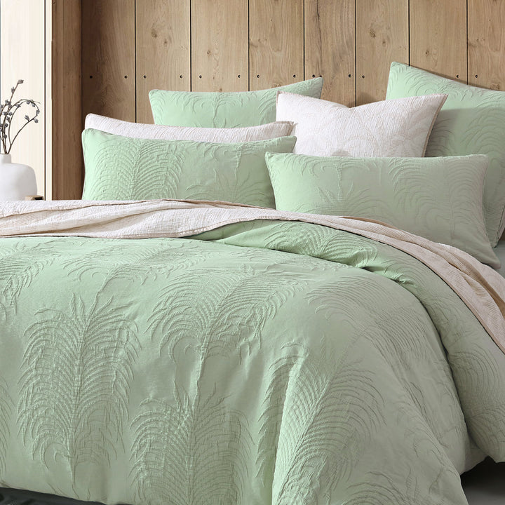 Platinum Logan and Mason Tropicana Sage Queen Bed Quilt Cover. Imagine a serene quilt cover adorned with sleek silhouettes of palm trees, creating a tropical oasis, the textural matelassé construction adds depth, inviting you to feel like you are on a tropical island. The quilt cover is piece dyed in a soft sage, ensuring an enduring appeal for years to come, a timeless escape to paradise in your own home.