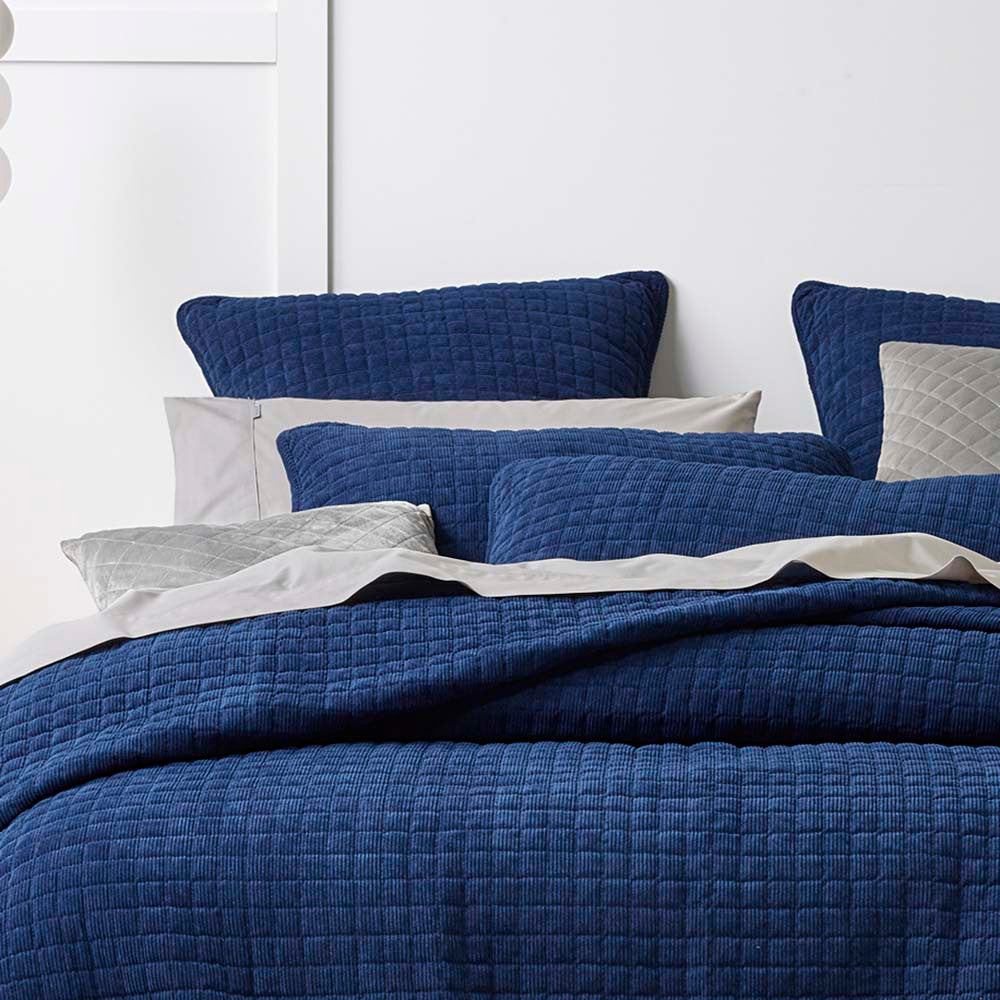 Bianca Turin Indigo Queen / King Bed Coverlet Set in a luxurious indigo colour, features a beautifully soft, corduroy fabric. The grid stitch quilting pattern is perfect for adding a touch of colour to your bedroom.