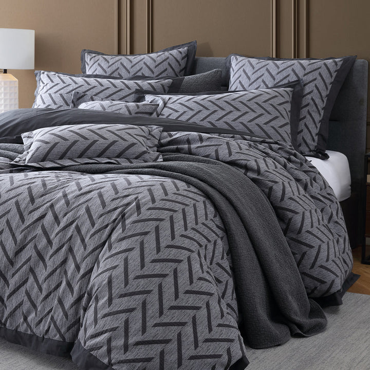 Private Collection Westport Charcoal King Bed Quilt Cover Set is modern and minimalistic, Westport features a refined and contemporary colour scheme in a bold textural herringbone pattern. This sophisticated ensemble is sleek and brings balance to a bedroom. Elevate this set with its matching European pillowcase for a more finished look. Coming in two sophisticated colourways to suit the colour scheme of your bedroom. A tailored attached flange completes the overall look.