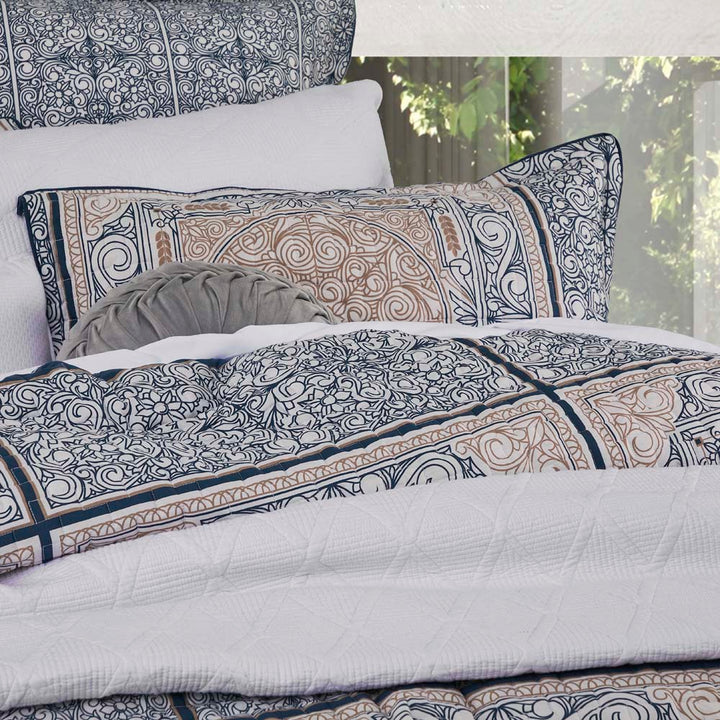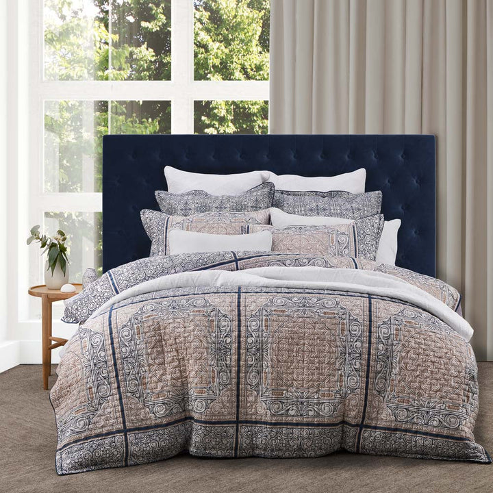 Private Collection Willard Navy Queen Bed Quilt Cover Set takes a contemporary approach to Moroccan influences. Intricate and ornate, the mosaic tiles repeat across the cover in a daring scale, tempered by the subtle palette. The illustrated contours play to a hand-crafted aesthetic while a layer of quilting adds downy-soft texture.
