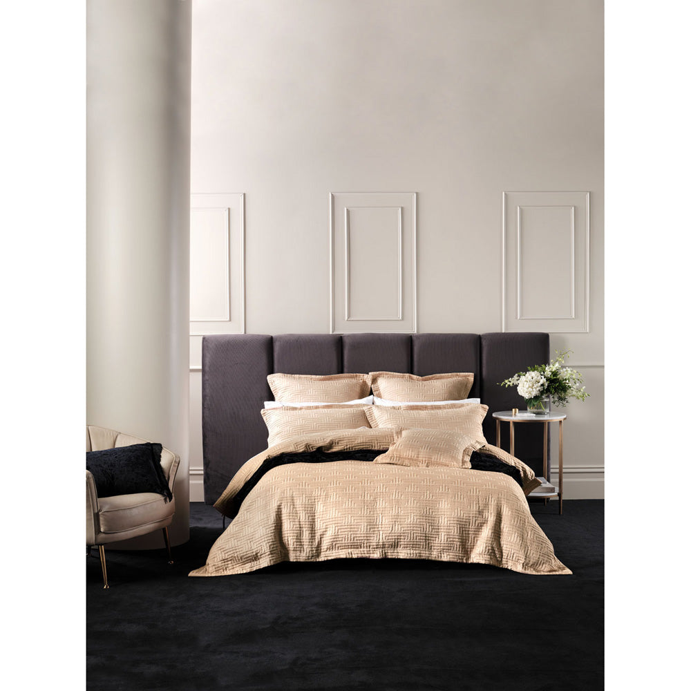 Grace by Linen House Winston Gold King Bed Quilt Cover Set enjoys a traditional geometric in a woven satin matelassé. This quilt cover set will elevate your bedroom to a level of timeless sophistication and luxury. Pair this with a pair of its coordinating European pillowcases and matching cushion for that finishing touch. This quilt cover reverses to a plain gold.