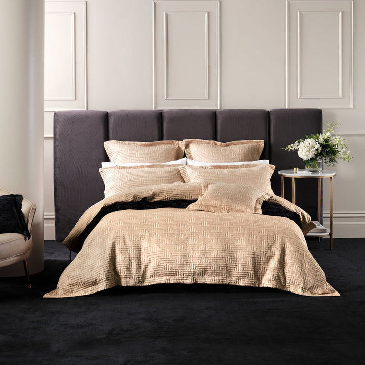 Grace by Linen House Winston Gold Queen Bed Quilt Cover Set enjoys a traditional geometric in a woven satin matelassé. This quilt cover set will elevate your bedroom to a level of timeless sophistication and luxury. Pair this with a pair of its coordinating European pillowcases and matching cushion for that finishing touch. This quilt cover reverses to a plain gold.